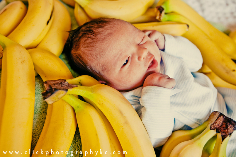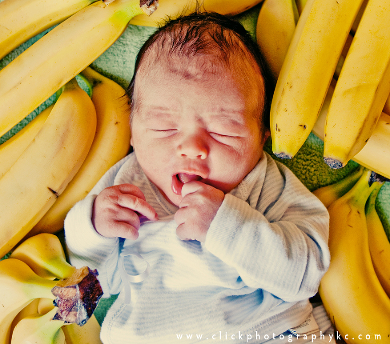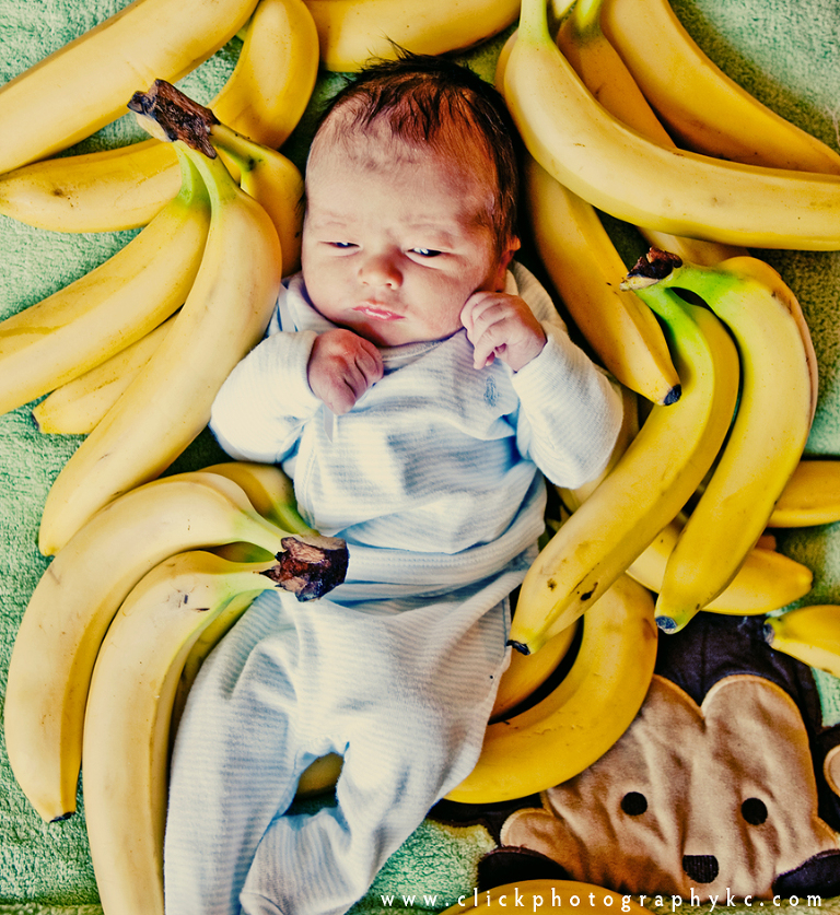 So…on the way to visit Al, Lacey, and baby Wyatt…I stopped in to a grocery store and gathered a BUNCH of bananas.  A LOT of bananas.  So much that I ended up buying a big reuse sack to carry them all.  When I went to check out with a counter full of just bananas, the cashier looks at me funny and says “soooo…uh…you makin’ a bunch of banana splits or what?” …I said something clever like “nope.  I just like my potassium.”  🙂 When I couldn’t hold a straight face any longer, I then explained I planned to put a newborn baby on top of the bananas for a picture.  I’m not sure which explanation sounded more sane.  Then, the guy in line behind me says, “Is it a girl?”.  This guy is super tall and rough looking, like a biker, but he’s got this friendly grin on his face from ear to ear.  I said no, that it was a boy.  He replies, “Oh, I just figured you were going for a Chiquita banana theme.”  I got sassy with him, put a hand on my hip and said “He’s a little monkey.  Hellllooo.” hahahaha  🙂