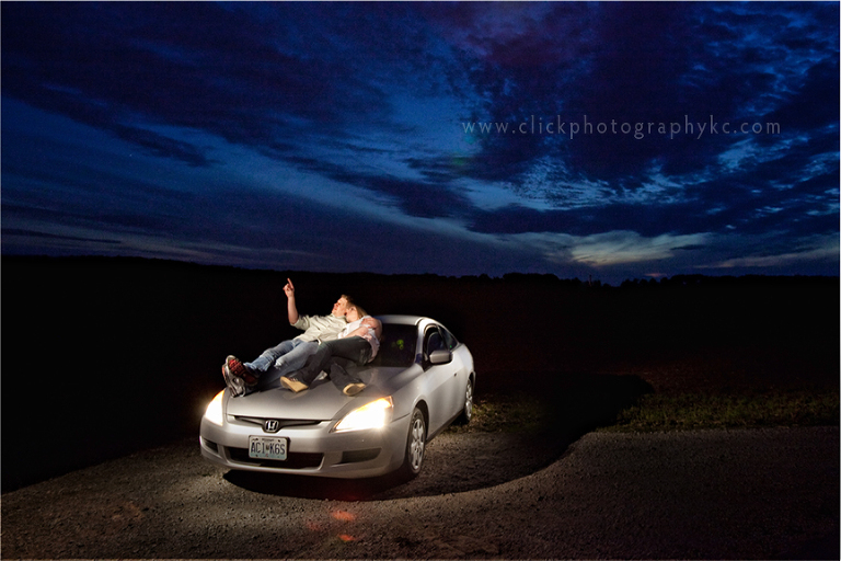 This was the second “Signature shot”. …I know, “Second one?” you say… Well, Adam & Carly had given me two different, but equally awesome ideas to spin off from…and I just had to do them both. …And I want to tell another little short story…Again having the idea in my head, finding the location is always the hard part. This location was discovered by fate. The day before the session, I was getting some machine press drilling done into rocks (crazy, I know…but it’s a special DIY wedding decoration I’m doing for my sister-in-law’s wedding)…so there I was leaving the man’s workshop and I get a phone call as I pull out. I had to stop the car and dig around in my purse for it…by the time I had found it, a train had pulled up over the crossing I needed to go through. …BUT, I am a patient person…so I wait….and wait…and WAIT…until finally I see the end of the never-ending-long-train…but just as the end gets close, the train slows down and stops…RIGHT OVER MY CROSSING! Again, trying to be patient, I think “Surely, it will start moving momentarily.” NOPE. In fact, while it was stopped, another never-ending train started through going the opposite way. Nice. So my tolerance level was breached and I decided to go on a little adventure down the road side I was on in hopes there was an outlet somewhere. I go down this basically-deserted road and found a new route to the highway…and in the process, I found this spot where there was absolutely NOTHING. Nothing. No houses, no buildings, no trees…no nothing. WALA again! My concept shot had a location picked out. I was so excited that I took Matt out there to show him that night (which was right before going to English Landing for the other location hot spot. Again, it was pitch dark…and let me tell you it was like something out of a scary movie. It was creepy dark & deserted….but again, well worth going out there for the shot. :))) Oh…and the idea behind this picture is that Adam told me that something he likes to do with Carly is lay outside and pick out stars and make up stories to tell her about them. So SWEEET! AH!