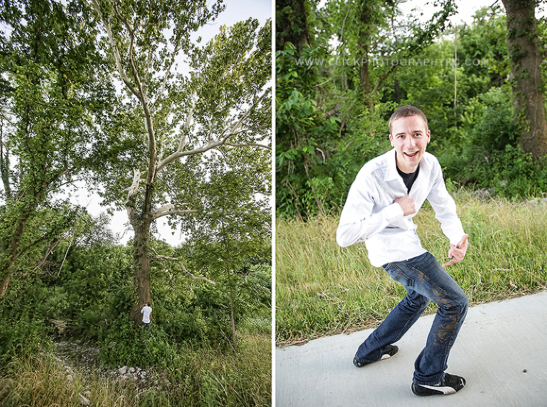 Ok…So I’ve had people climb trees at my sessions before, but usually they are trees that are CLIMBABLE. Craig (AKA: Rockclimber-crazy-man) took it upon himself to give himself a challenge. I was in the process of setting up some light gear while he wondered over to a big ass tree (as seen on left) and decided to pick up some wear rusty bent rod thingie and use it to pull himself up a large white branch (seen in the photo above and slightly to his right). I admit I was only half paying attention because I didn’t think it was possible for him to get up…but when I saw he’d managed to get it up there and start pulling himself up, I had a little voice in my head that told me I should really be videoing this…and I’m glad I listened. The exact, I MEAN EXACT, moment I pressed the record button, the branch broke and Craig fell UPSIDE-DOWN…from I’d say at least 12 feet (It’s downhill on that side of the tree, so the branch he climbed was even higher off the ground than appears in image). Normal…repeat NORMAL, people react with heart stopping, hold breath, jaw dropped, eyes wide open reactions…which was what I was doing. Jennie is so desensitized to Craig’s little stunts that she was calm and giggly. HAHAHAHA (picture on right was his “after” shot).jpg)